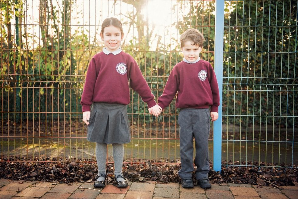 Girls: Burgundy sweatshirt with school crest, Grey skirt or pinafore, White socks, grey or burgundy tights, Black shoes, Blue checked dresses (summer time)